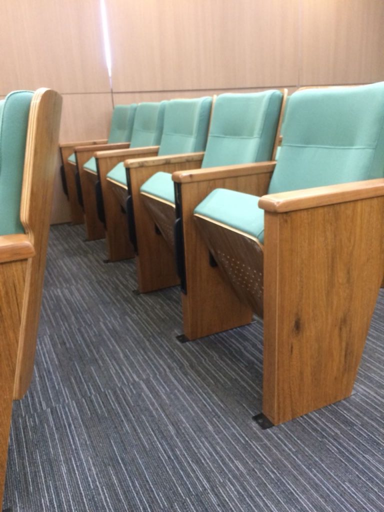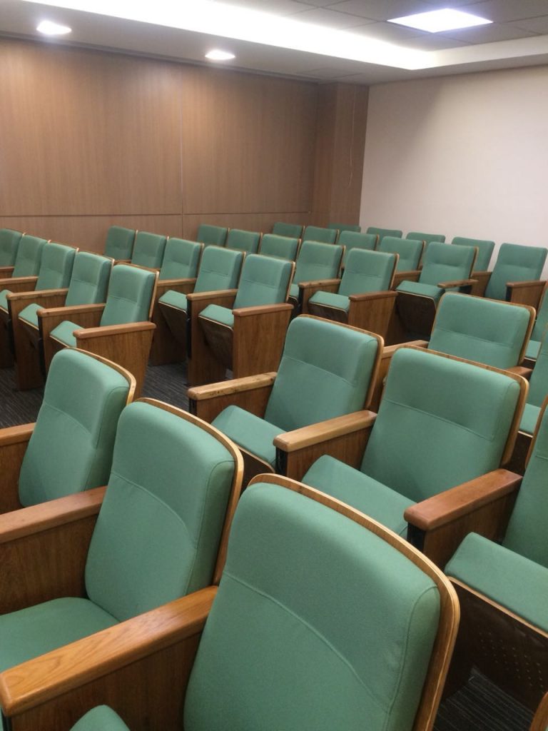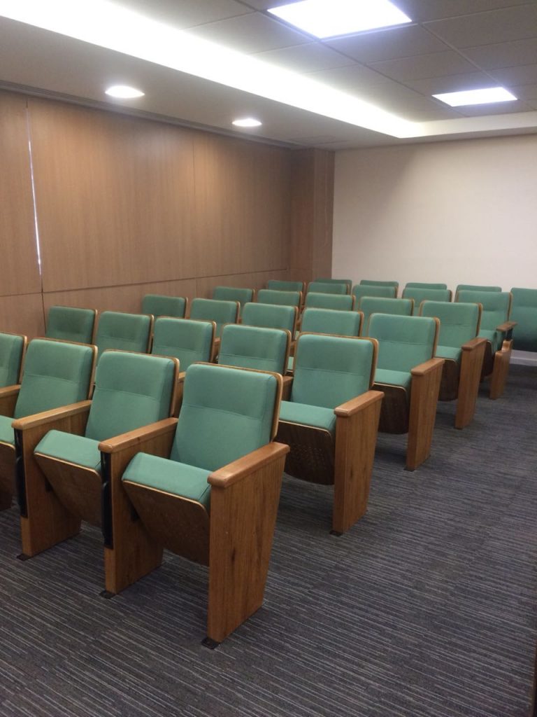 O auditório da Faculdade de Medicina da UFMG está totalmente de cara nova. O projeto é do arquiteto Ronaldo Campos. A partir da demanda de preservação da estrutura arquitetónica, ele propôs um projeto que atualizou o layout do espaço.